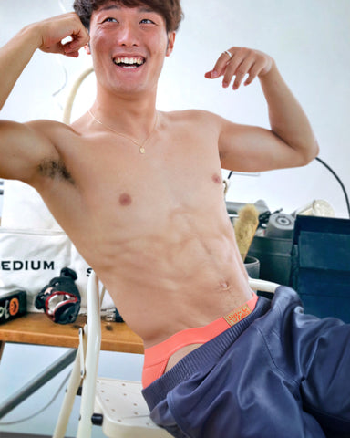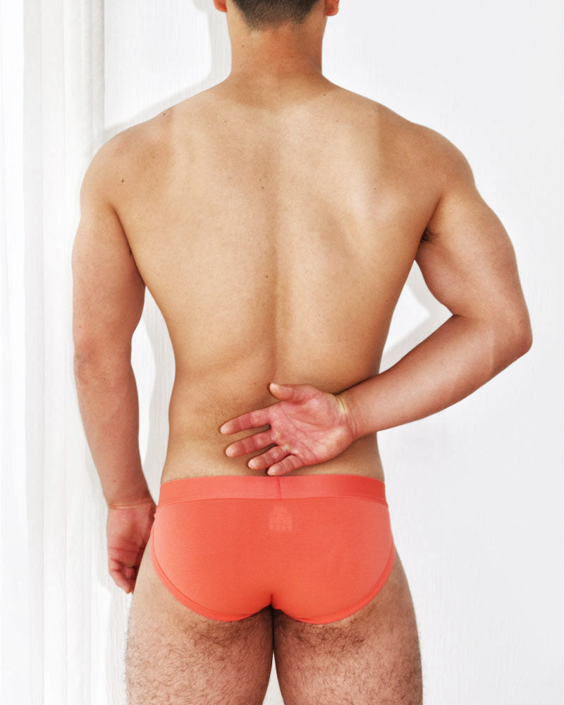 腰帶與內褲為紅橘色,補丁布貼為大地色配上亮紅色浮紋logo,